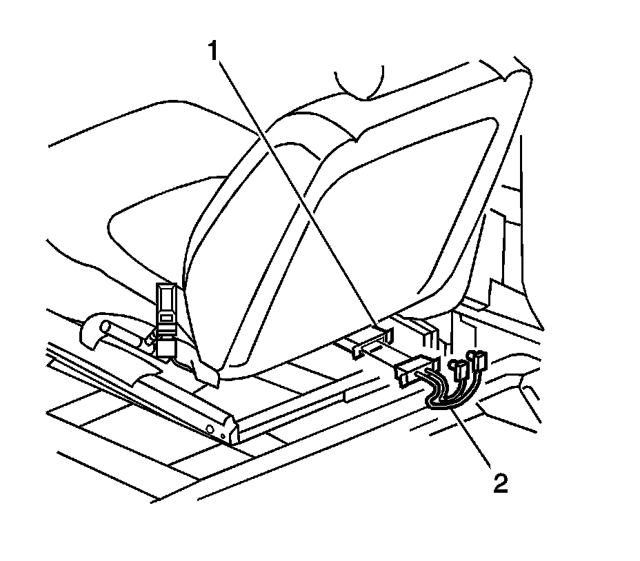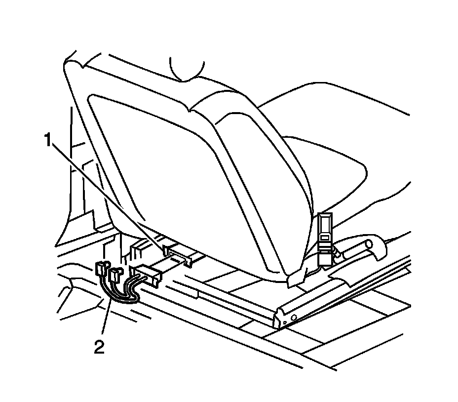 22. Disconnect the driver side air bag/pretensioner yellow connector (1) from the vehicle wiring harness connector (2) located under the rear of driver seat.