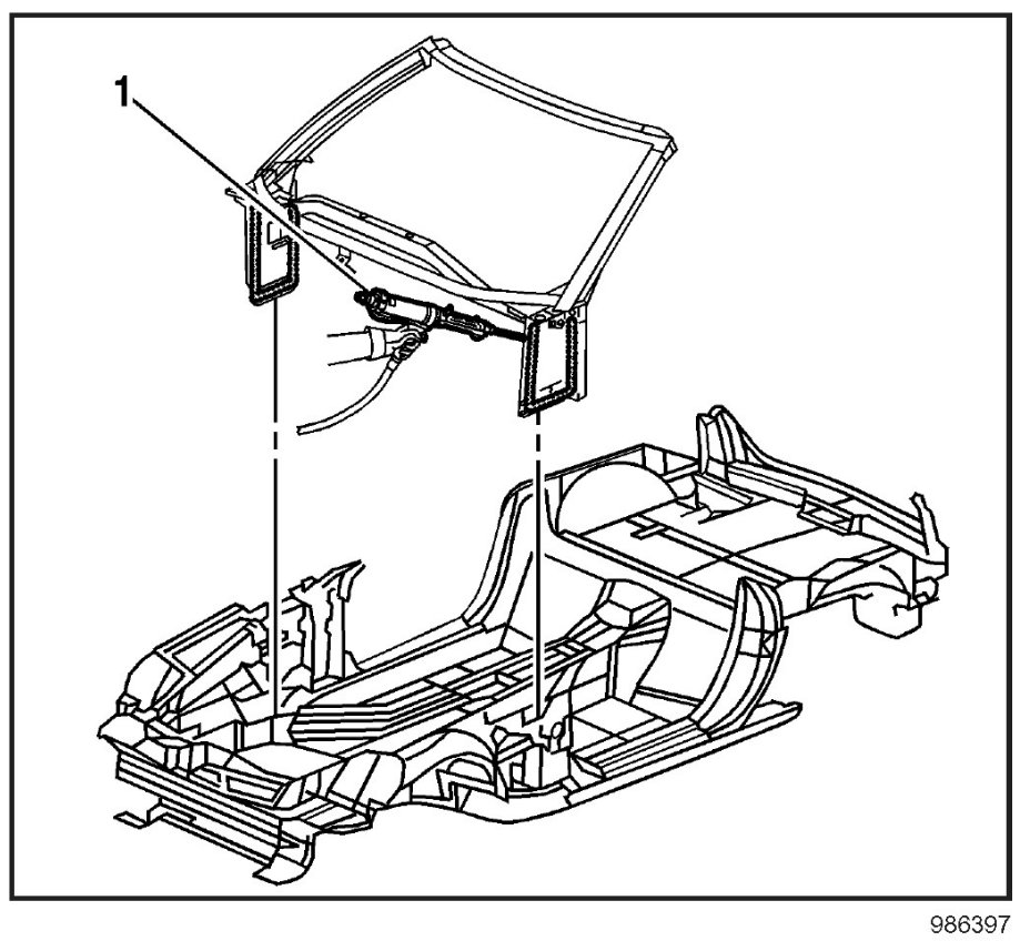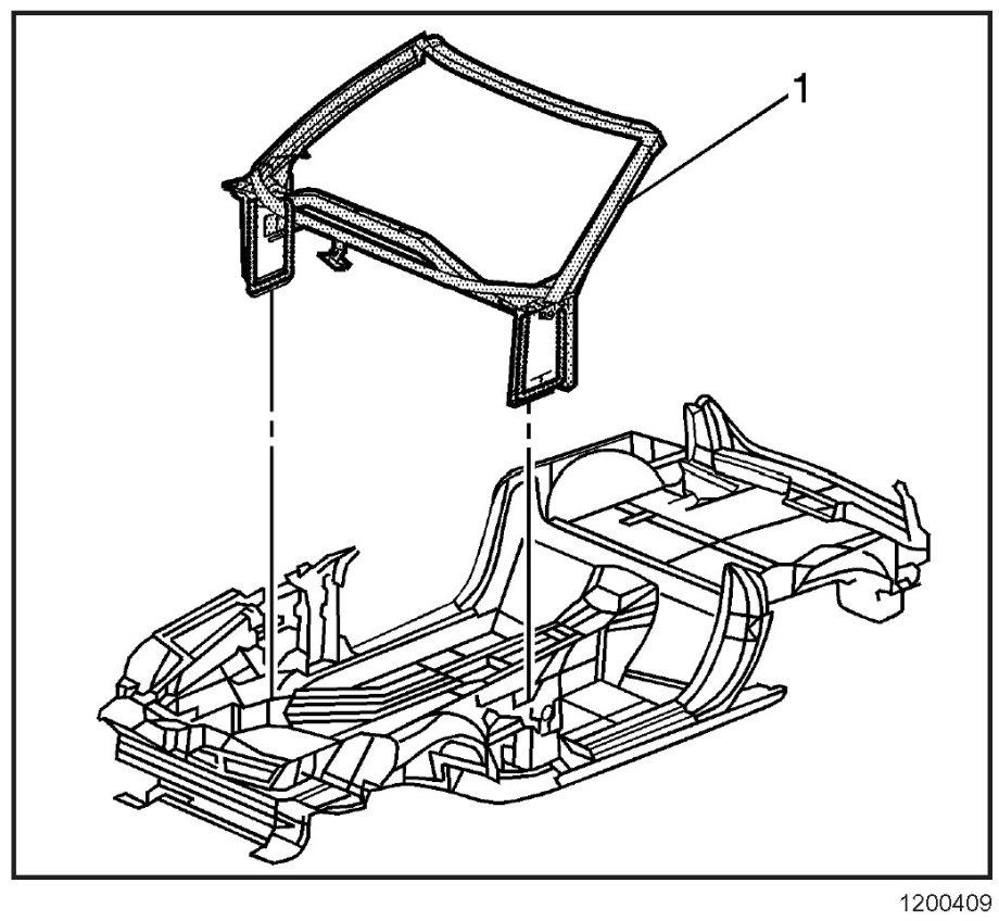 3. Apply a consistent bead of structural adhesive (1) 10 mm (3/8 in) in diameter to the windshield frame to mate with the bonding surfaces. Refer to Sheet Molded Compound (SMC) Panel Bonding.