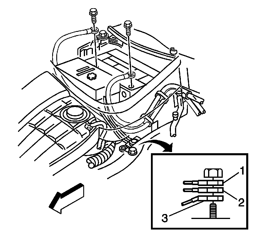 25. Remove the ground strap nut and terminal from the stud on the frame.