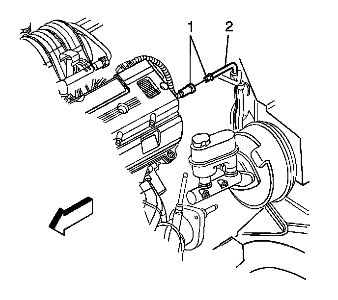 8. Disconnect the evaporative emission (EVAP) canister purge pipe (1) from the chassis purge pipe (2).