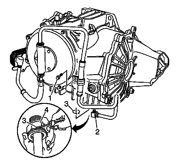 2. Connect the differential cooler pump inlet pipe (2) to the differential. A distinct snap should be heard or felt when assembling the cooler pipe to the fitting.
