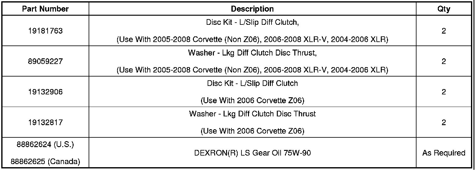 5. Fill the differential with the new DEXRON(R) LS gear oil, P/N 88862624 (Canadian P/N 88862625). Refer to the table listed below for lubrication specifications.