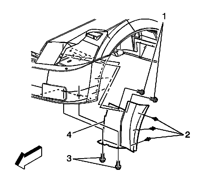 1. Remove the fasteners (1, 3) and push-pins (2) from the forward wheelhouse splash shield (4) to access the underside of the bumper cover.