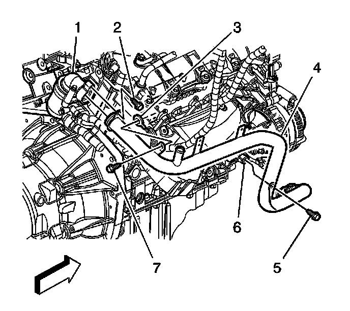3. Install the coolant pipe (4), NEW seal, and fasteners (2 and 7). Refer to Engine Coolant Inlet Pipe Replacement (Service and Repair) .