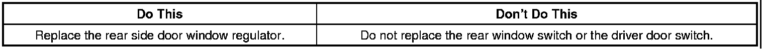 Replace the rear window regulator with an updated part. Refer to Rear Side Door Window Regulator Replacement in SI.