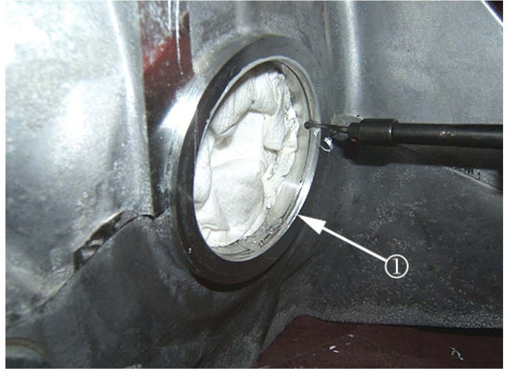 Place a clean, lint-free shop towel inside the right side differential seal bore to protect the bearings from any chips created by this process.
