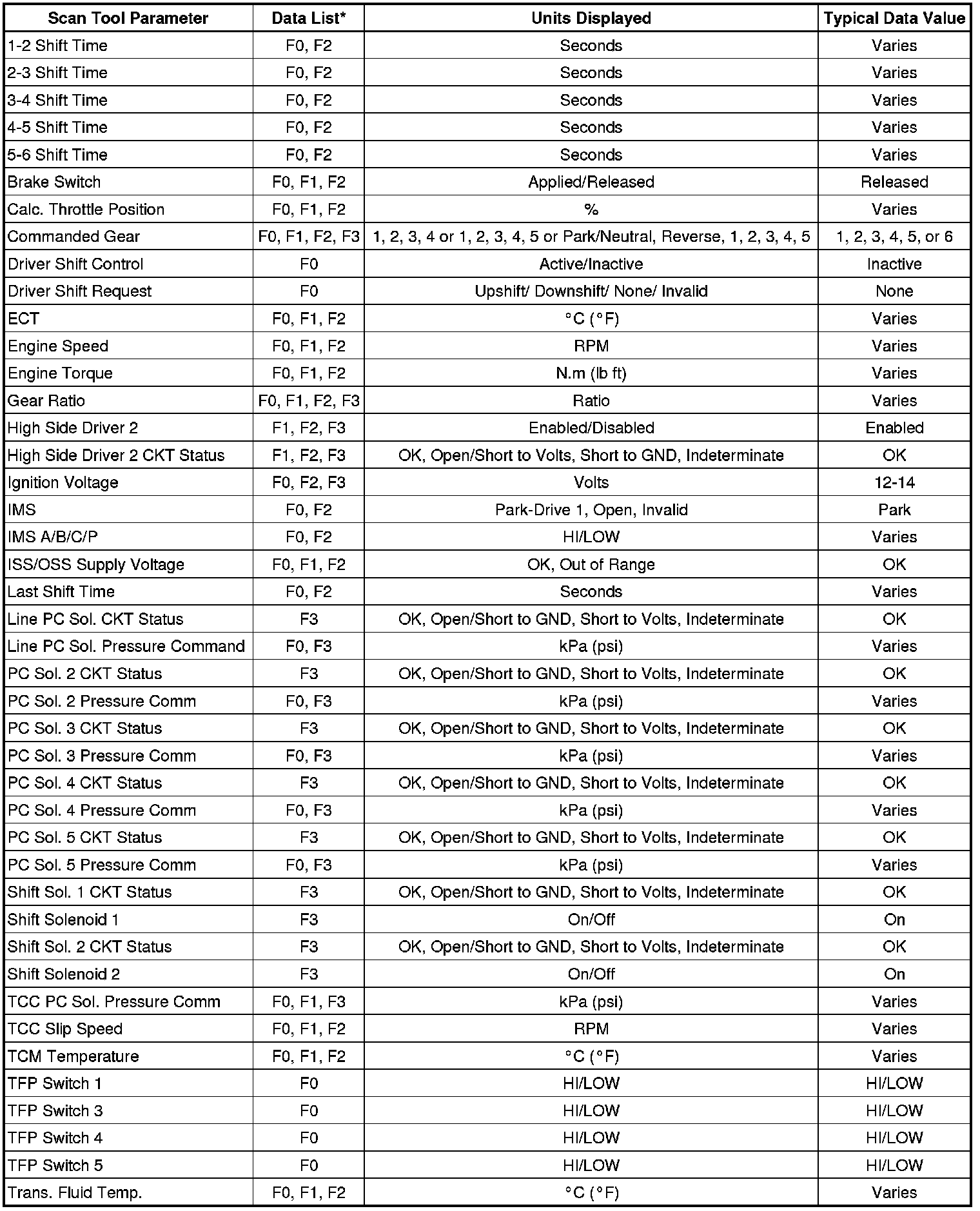 Only the parameters listed below are used in this manual for diagnosing. If a scan tool displays other parameters, the values are not recommended by General Motors for use in diagnosis.