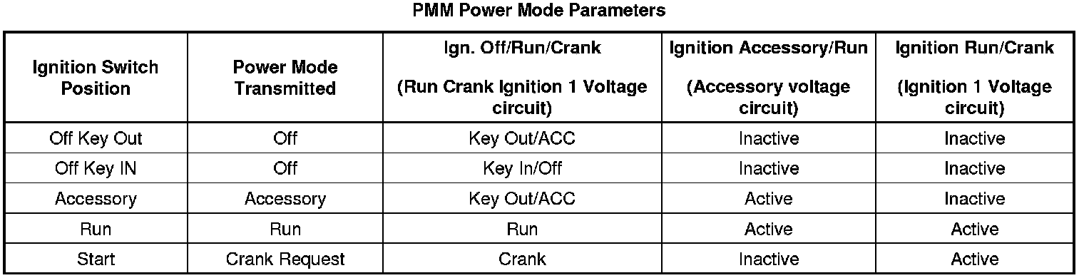 The PMM receives ignition switch signals to identify the operators desired power mode. The PMM Power Mode Parameters table below illustrates the correct state of these input parameters (circuits) in correspondence to the ignition switch position: