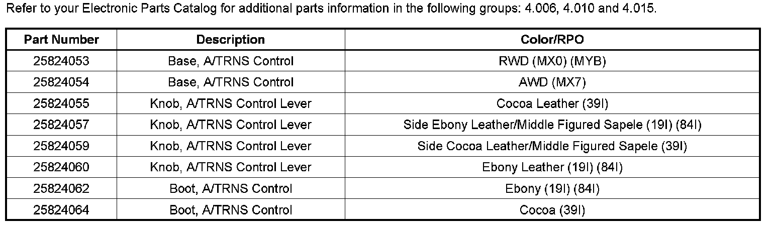 The shifter control base, shifter knob and shifter boot are now available separately for service. These components were previously available only as part of the complete shifter control assembly.