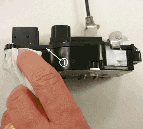 3. With the latch hanging from the clip and cable, remove grease from the latch cover-to-housing seam (3) using a paper towel.