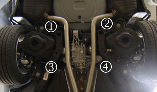 2. Remove the frame to body mounting bolts one at a time in the order shown above (1, 2, 3, 4). Install one washer, GM P/N 1646989, in the following location on the bolt (1).