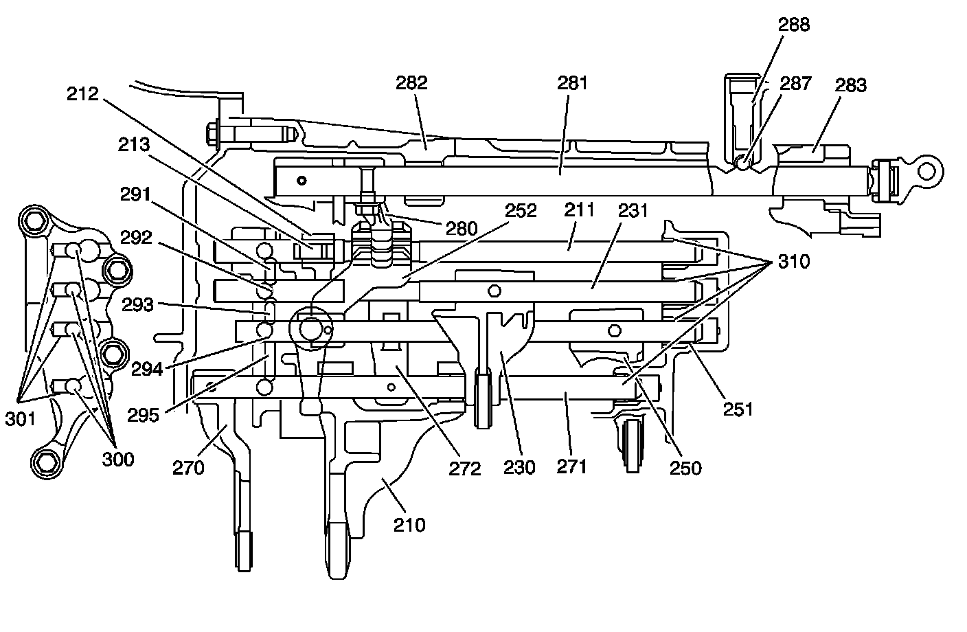 The 5th/6th shift shaft (251) is located third from the top. A pin holds the 5th/6th shift head (252) in place on the shift shaft. A bolt holds the 5th/6th shift fork (250) in place on the shift shaft. A small shift shaft interlock pin (294) in the 5th/6th shift shaft (251) prevents the other shafts from moving. Interlock pins (293 or 295), located in the interlock bracket, contact the small interlock pin (294) and lock into a notch on the shift shaft, preventing multiple shift shaft movement.
