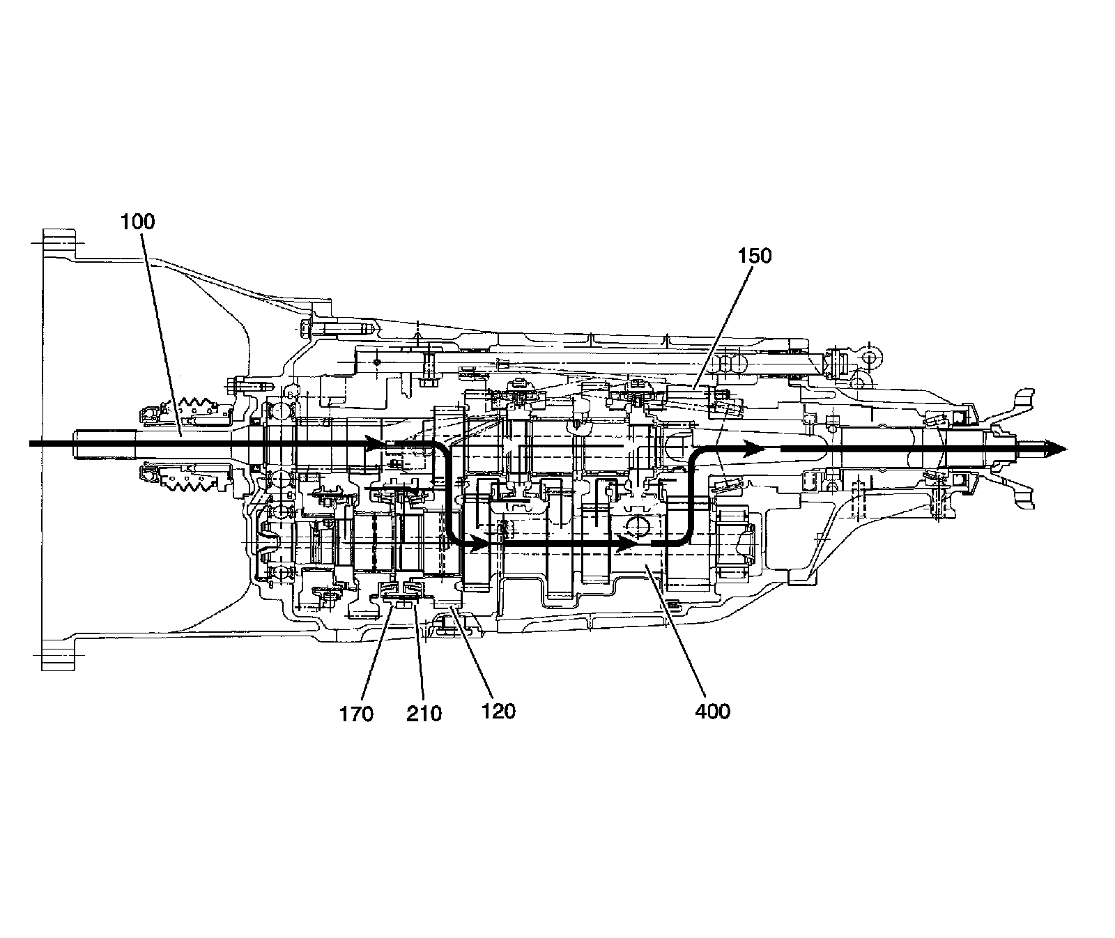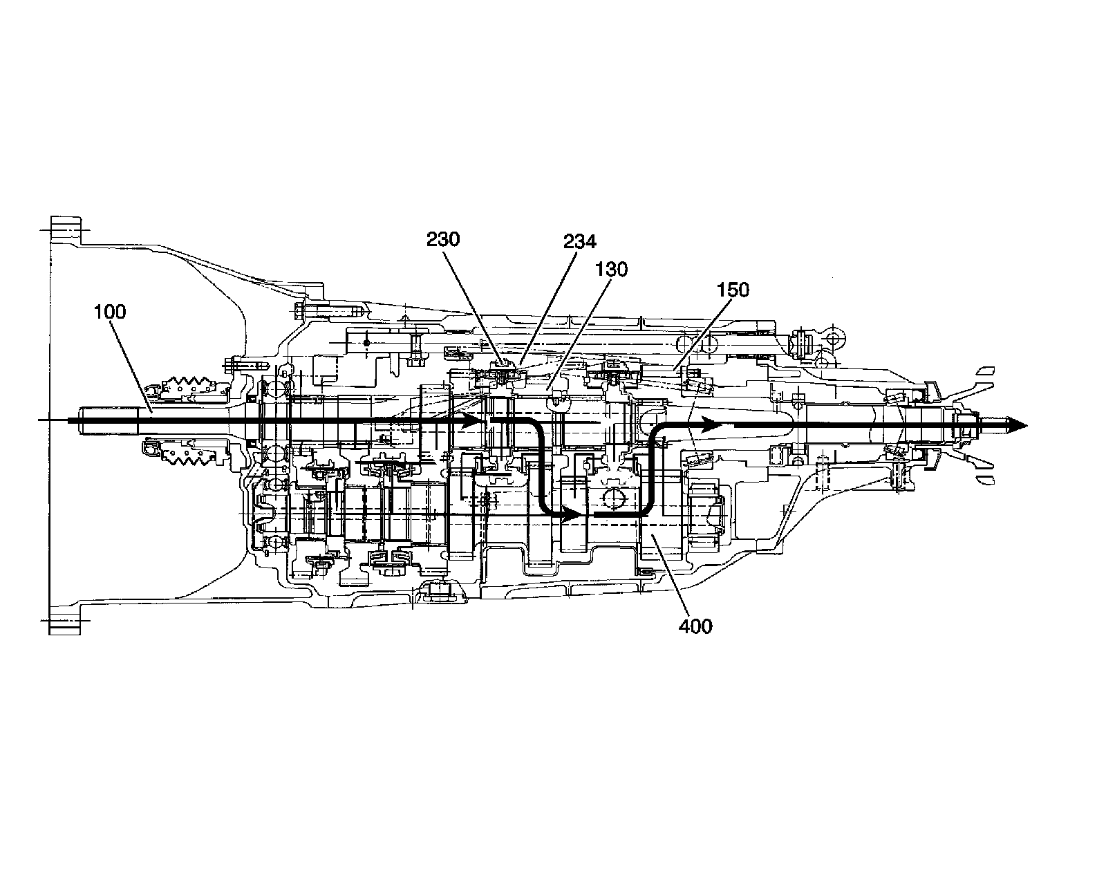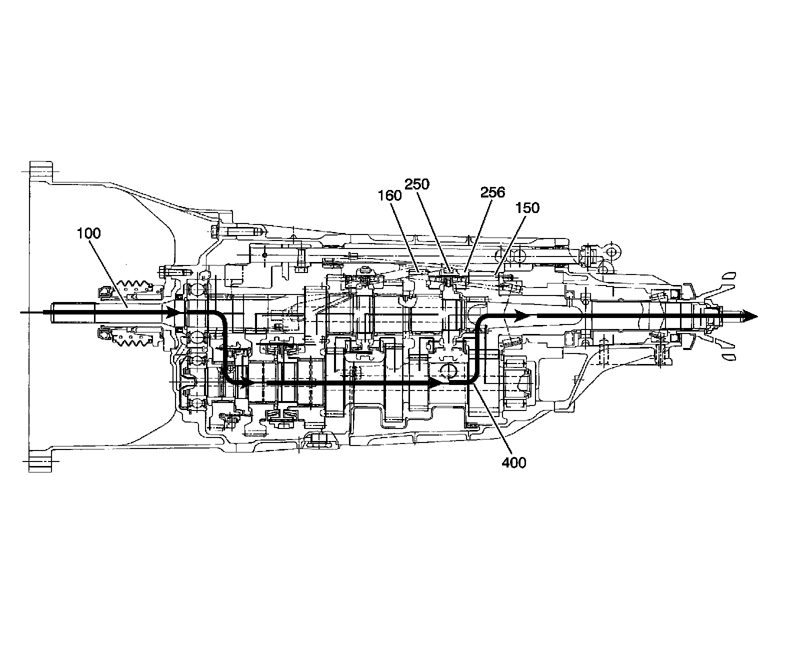 the 6th gear (160) is an overdrive ratio. Moving the 5th/6th shift fork (250) forward moves the 5th/6th synchronizer sleeve (256). The synchronizer sleeve (256) slides on the synchronizer hub. The inner teeth on the synchronizer sleeve push against the synchronizer ring teeth, causing the synchronizer ring to contact, and the 6th gear (160) and the input shaft to match speeds. The synchronizer sleeve (256) then engages the selector teeth on 6th gear (160). The synchronizer hub is pressed on the input shaft (100). Power flow is now from the input shaft (100) through the synchronizer to the 6th gear (160) to the countershaft (400) and to the output shaft (150), which now turns faster than the speed of the input shaft (100).