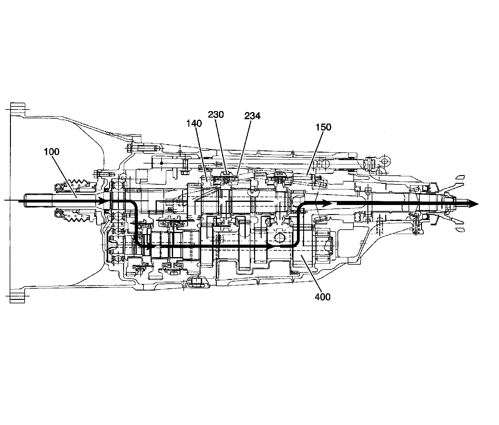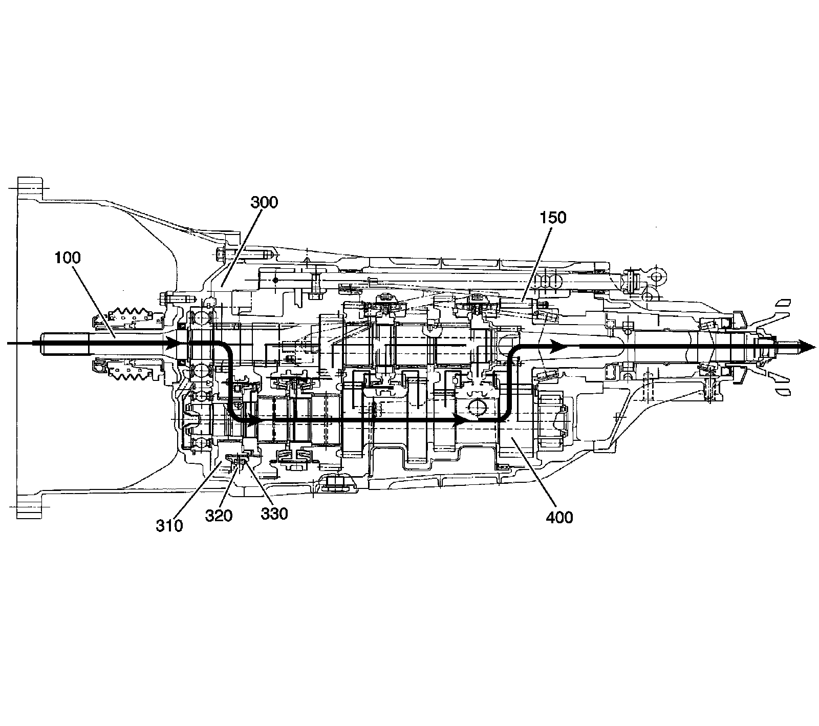 The reverse idler gear (300) is located on the reverse idler shaft and rotates on needle bearings. The reverse idler gear (300) engages with the input shaft (100) and with the reverse gear (310). Moving the reverse shift fork (320) rearward moves the reverse synchronizer sleeve (330). The synchronizer sleeve (330) slides on the spline of the reverse gear. The inner teeth on the synchronizer sleeve push against the synchronizer ring teeth, causing the synchronizer ring to contact, and the reverse gear (310) and the countershaft to match speeds. The synchronizer sleeve (330) then engages the selector teeth (340). The selector teeth are pressed on the countershaft (400). Power flow is now from the input shaft (100) to the reverse idler gear (300), to the reverse gear (310), through the synchronizer to the countershaft (400) and to the output shaft (150).