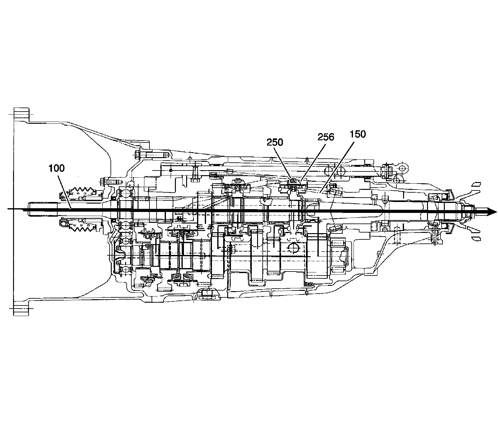 In 5th gear, the power flow goes directly from the input shaft (100) to the output shaft (150) through the 5th/6th synchronizer. This happens because 5th gear is the same ratio as the engine speed. Moving the 5th/6th shift fork (250) rearward moves the 5th/6th synchronizer sleeve (256). The synchronizer sleeve (256) slides on the synchronizer hub. The inner teeth on the synchronizer sleeve push against the synchronizer ring teeth for output shaft (150). Matching the input shaft (100) to the output shaft (150) allows the synchronizer sleeve to engage to the selector teeth on the output shaft (150). The synchronizer hub is pressed on the input shaft (100).