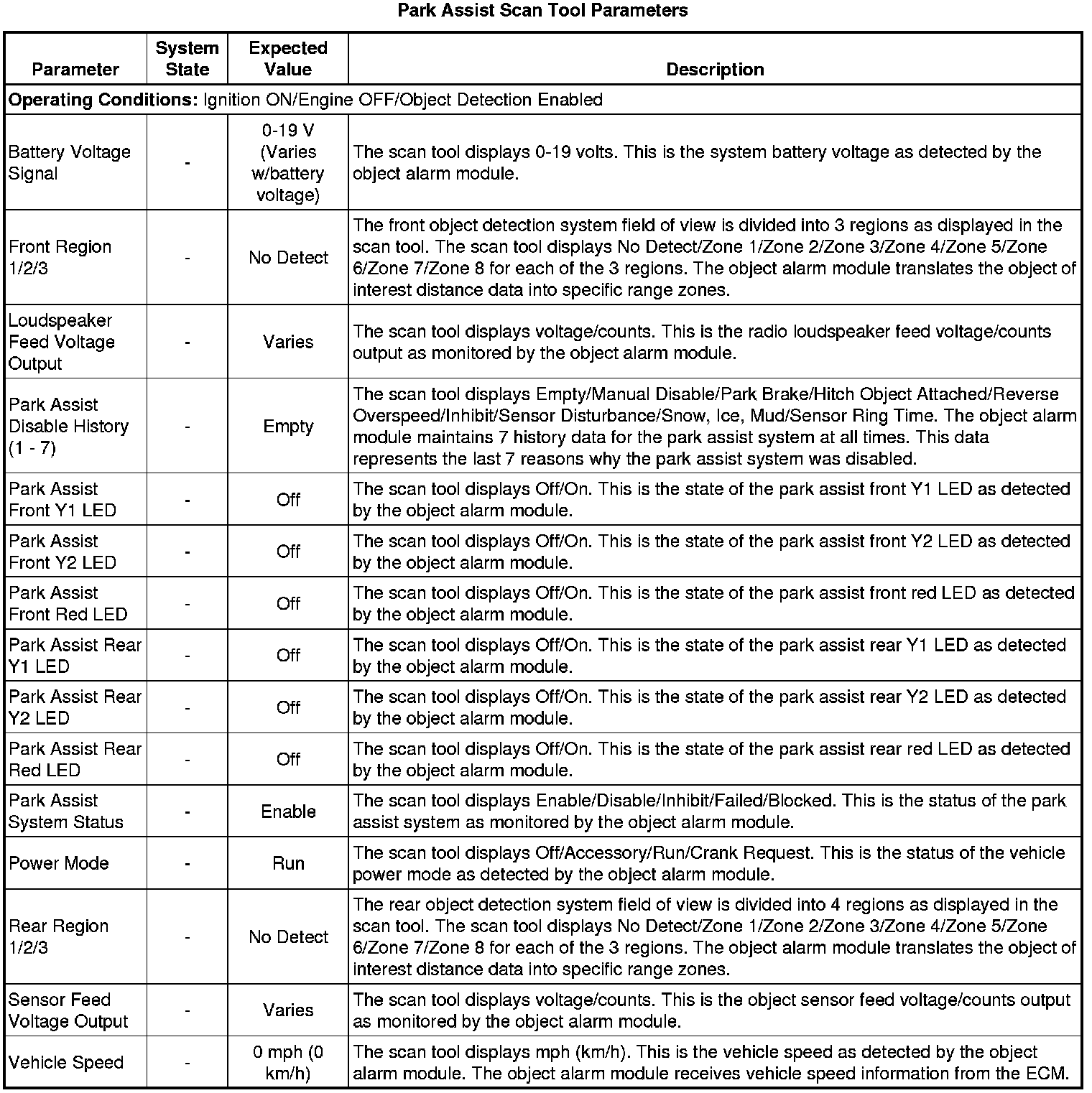 Use the object detection scan tool data list as directed by a diagnostic table or in order to supplement the diagnostic procedures. Begin all of the diagnostic procedures with the Diagnostic System Check - Vehicle. Use the scan tool data list after the following is determined: