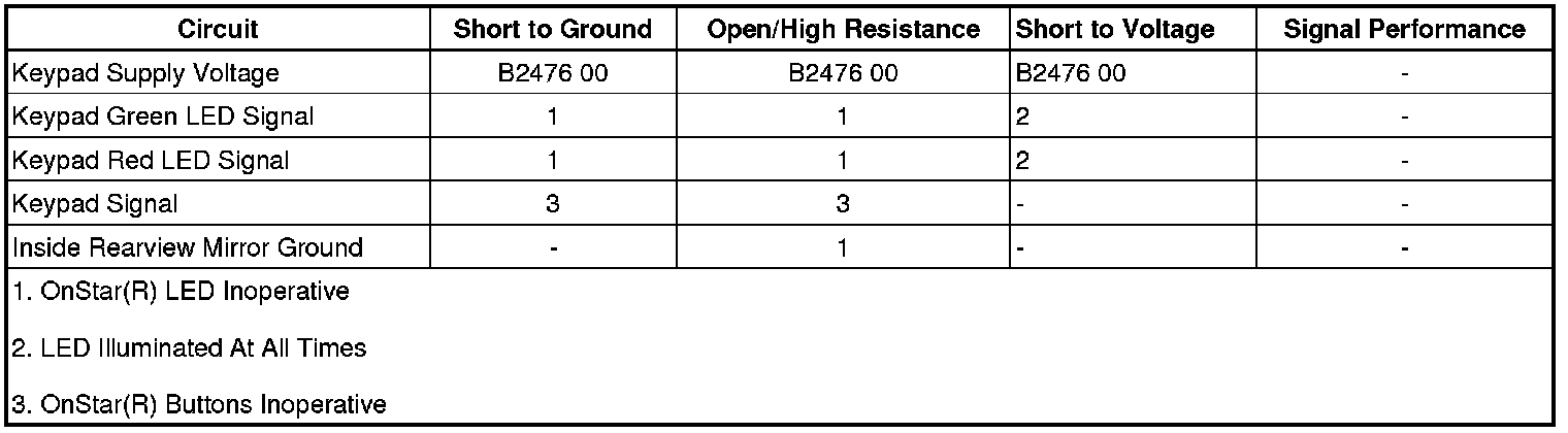 The OnStar(R) status LEDs are located with the OnStar buttons.. The green LED is illuminated when the system is ON and operating normally. When the green LED is green and flashing, it is an indication that a call is in progress. When the red LED is illuminated, a system malfunction is present. In the event there is a system malfunction and the OnStar(R) system is still able to make a call, the LED will flash red during the call. The OnStar(R) LEDs are controlled by the communication interface module (CIM) via the keypad green LED signal circuit and the keypad red LED signal circuit.