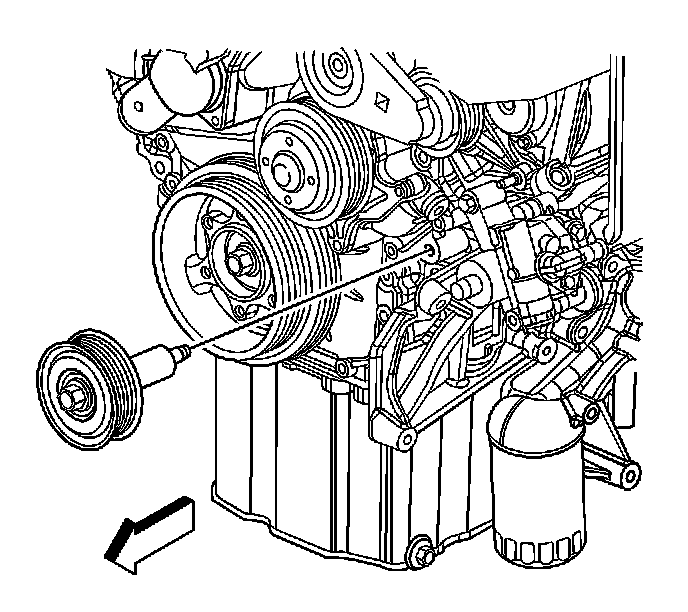 6. Remove the drive belt tensioner. Refer to Drive Belt Tensioner Replacement - Generator (Drive Belt Tensioner Replacement - Generator) and to Drive Belt Tensioner Replacement - Air Conditioning, Power Steering, and Water Pump (Drive Belt Tensioner Replacement - Air Conditioning, Power Steering, and Water Pump) .
