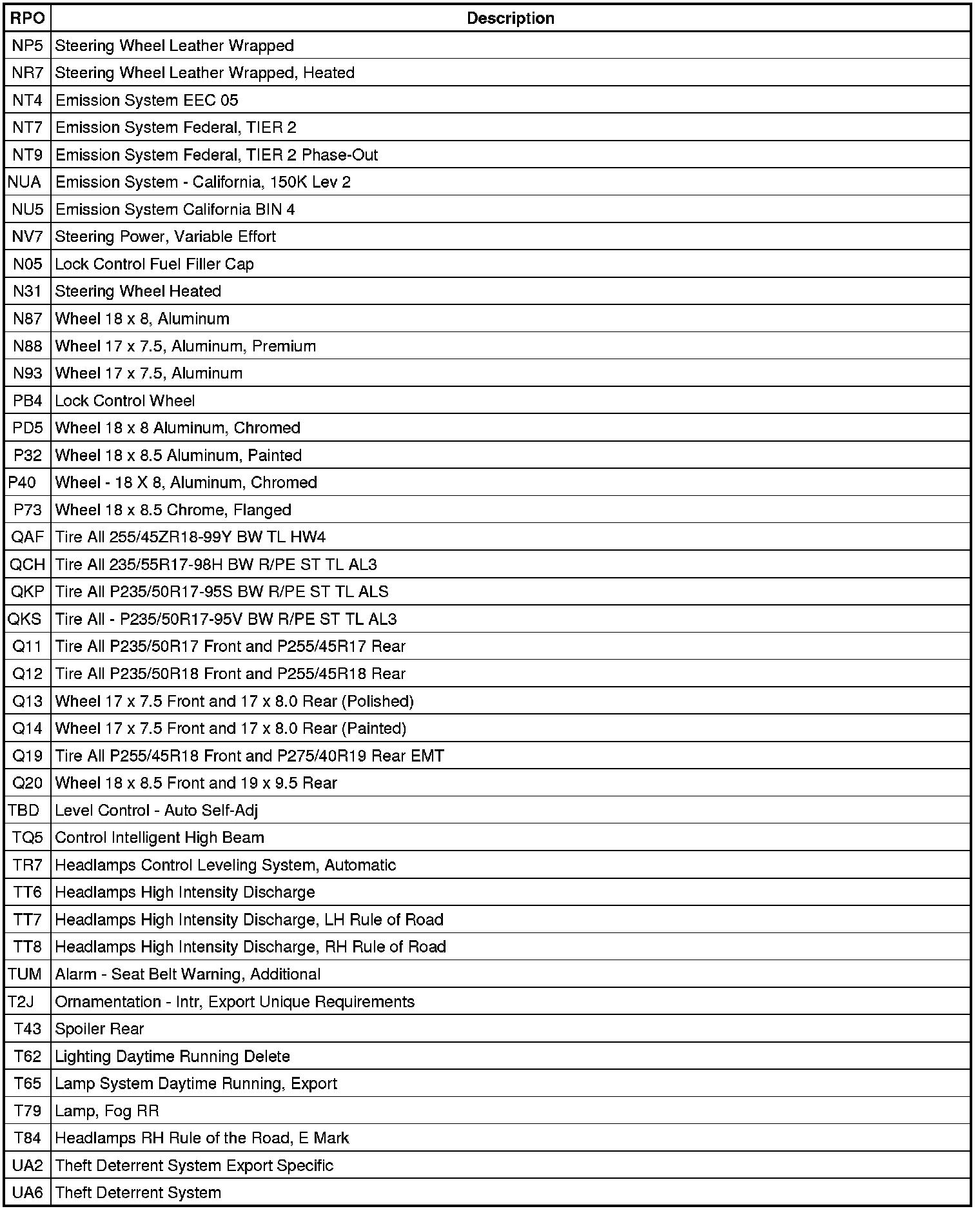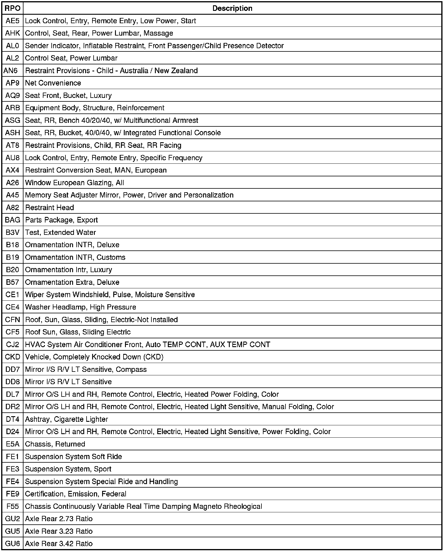 The following table provides the description of the Regular Production Option (RPO) codes that are available on the vehicle. The vehicle's RPO list is printed on the Service Parts Identification Label.