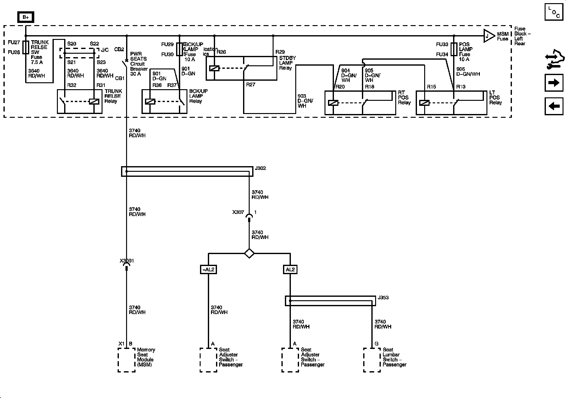 BCK/UP LAMP, POS LAMPS, and TRUNK RELSE Fuses, PWR SEATS Circuit Breaker