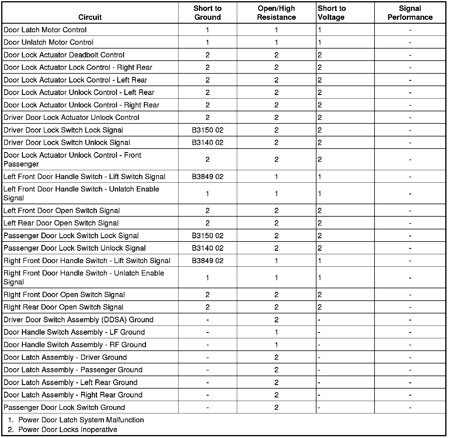 • If the test lamp does not illuminate, test the signal circuit for a short to ground or an open/high resistance. If the circuit tests normal, replace the appropriate door control module.