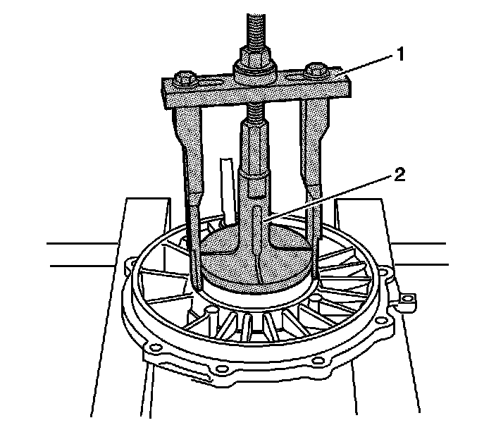 20. Place J 45124 (1) over DT-47596 (2). Adjust the legs for best fit. Install supplied bolt, nut, thrust bearing and washer. Hold the bolt and tighten the nut to remove the bearing cup and shim.