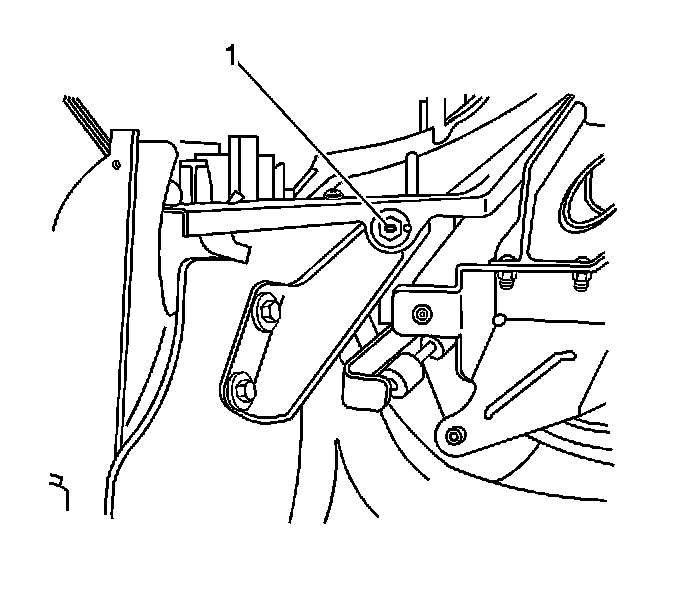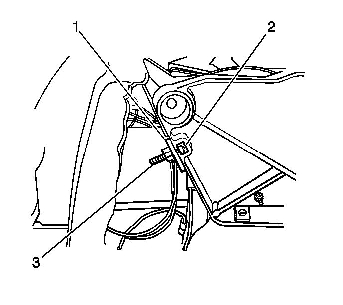 16. Install the fastener (1) to the bracket retaining the rear door release cable (2).