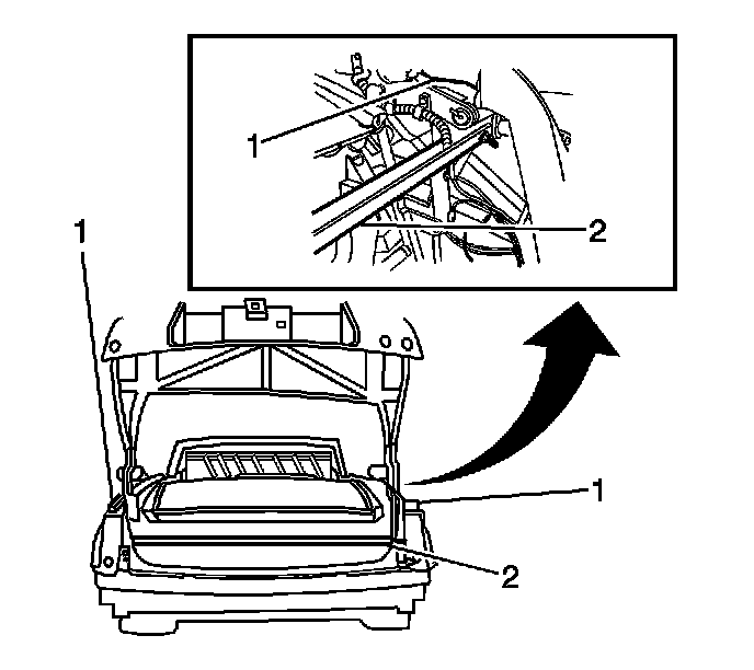 27. Remove the fastener (1) from the retaining bracket that holds the rear mounted door release cable (2).