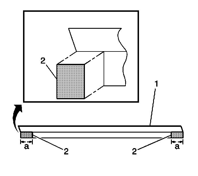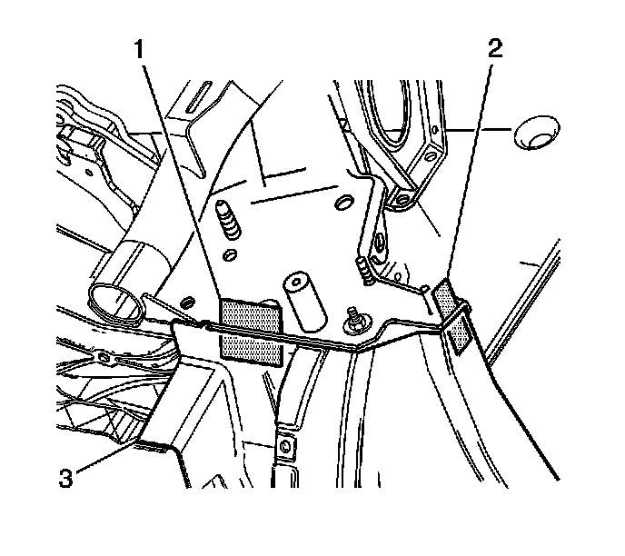 35. Apply a consistent bead of structural adhesive to the bonding mating surfaces on the backing plates (1,2) and on the vehicle (3). Refer to Sheet Molded Compound (SMC) Panel Bonding () .
