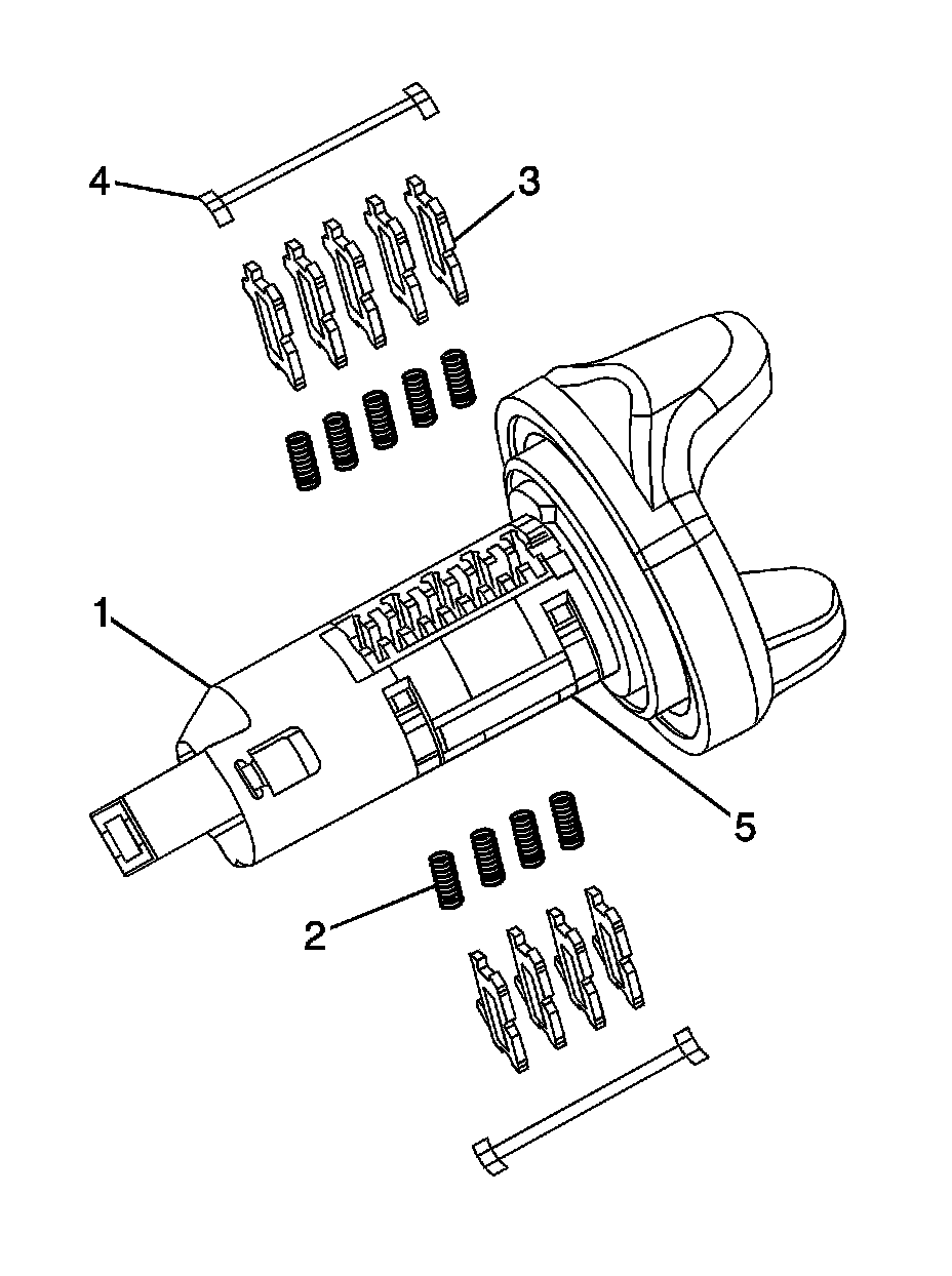 The instrument panel (I/P) compartment door lock cylinder uses 4 of the 10 key cut positions, 7-10 when counting from the key head. The tumbler orientations alternate in adjacent locations with all 4 tumblers (3) located on the same side. A stainless steel retaining tumbler is used in the I/P compartment door lock cylinder to retain the lock cylinder in the latch assembly and does not move when the key is inserted. The retaining tumbler is located in the tumbler slot closest to the head of the cylinder assembly (1) and comes pre-installed in the cylinder.