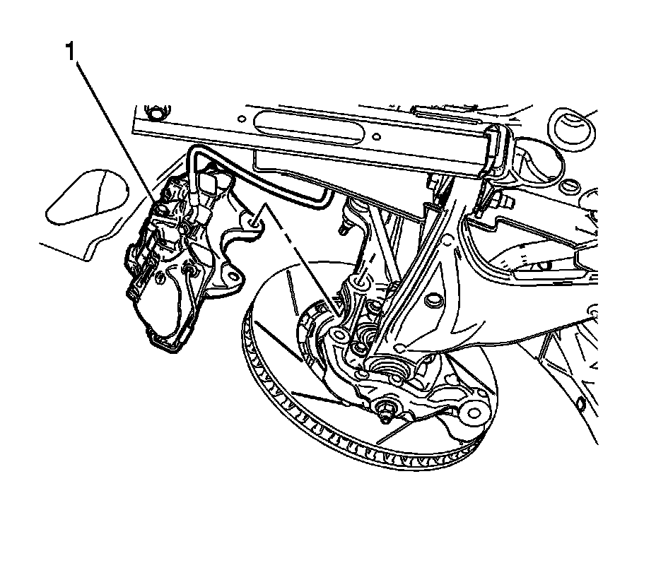 Caution: Support the brake caliper with heavy mechanic wire, or equivalent, whenever it is separated from its mount and the hydraulic flexible brake hose is still connected. Failure to support the caliper in this manner will cause the flexible brake hose to bear the weight of the caliper, which may cause damage to the brake hose and in turn may cause a brake fluid leak.