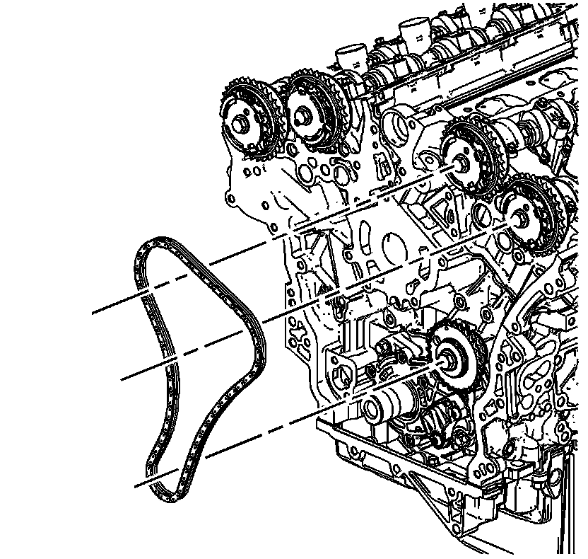 1. Install the left bank secondary camshaft drive chain. 115. Secondary Camshaft Intermediate Drive Chain Installation - Left Side
