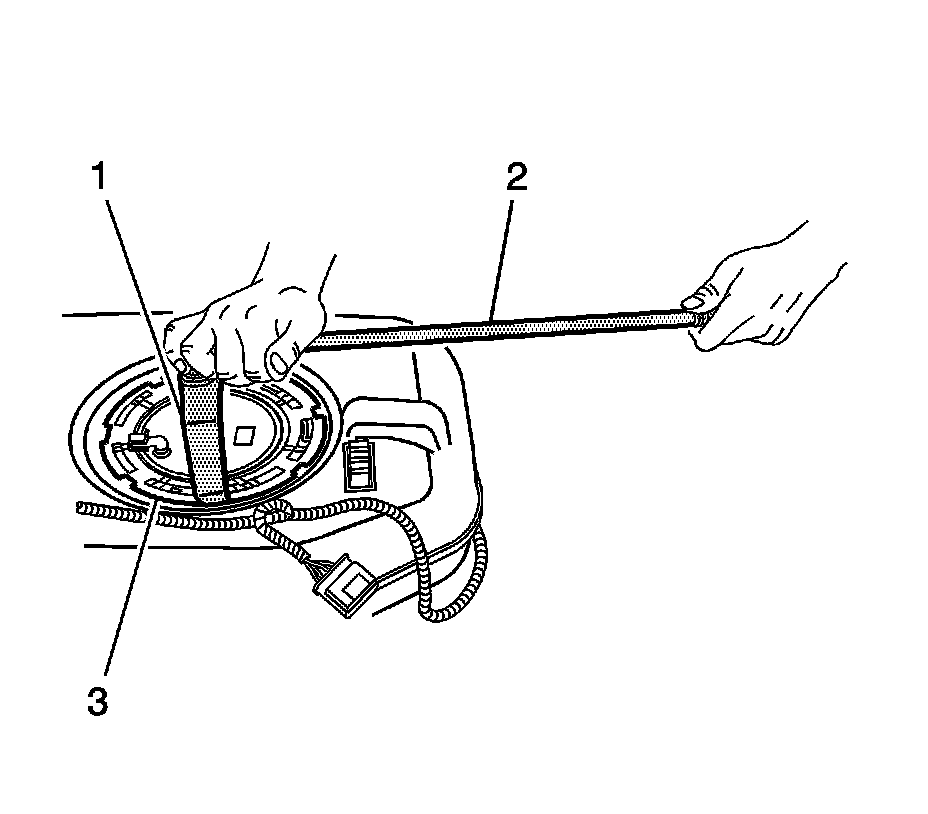 3. Use the J 45722 (1) and a long breaker-bar (2) in order to unlock the fuel tank module lock ring (3), by turning counterclockwise.