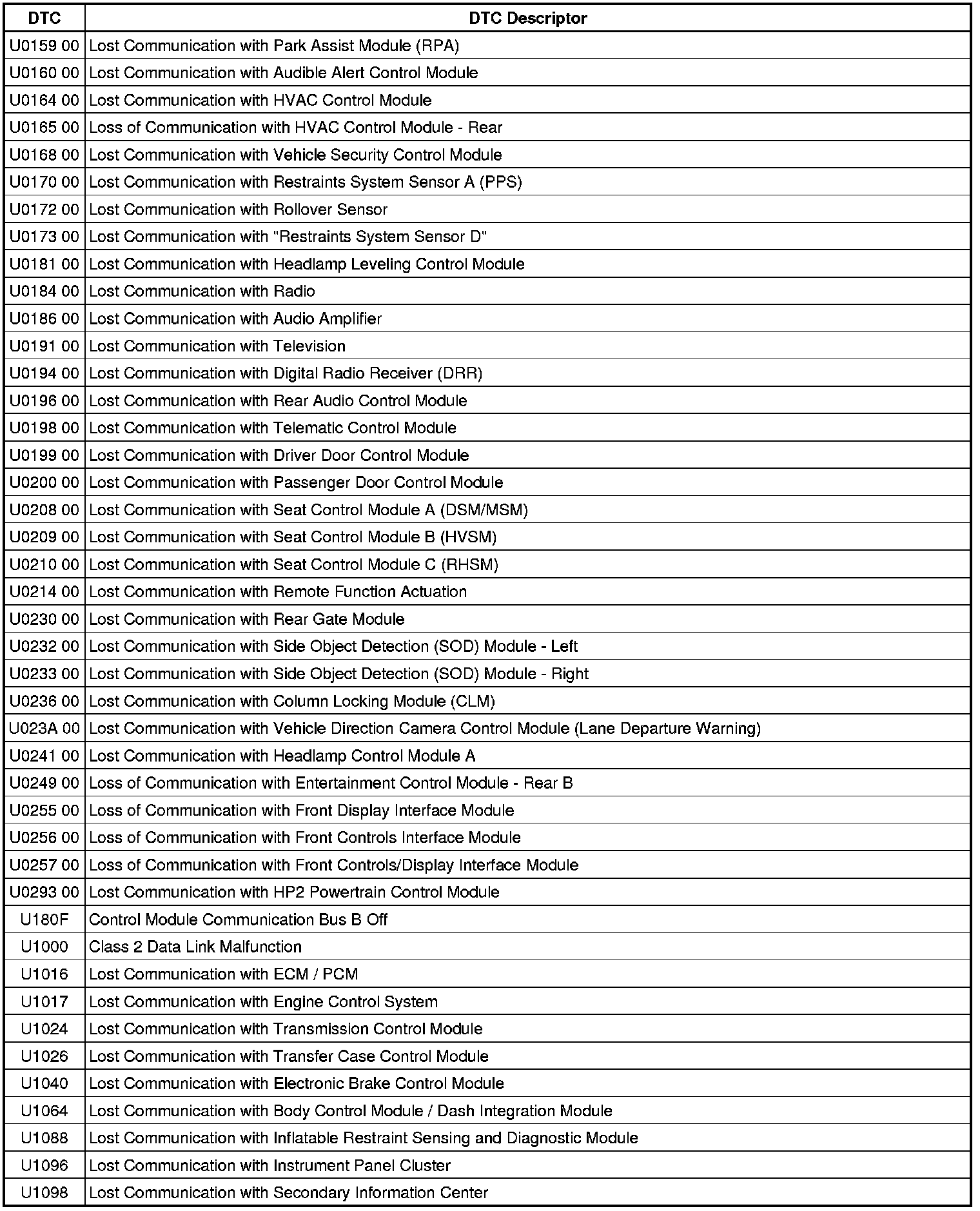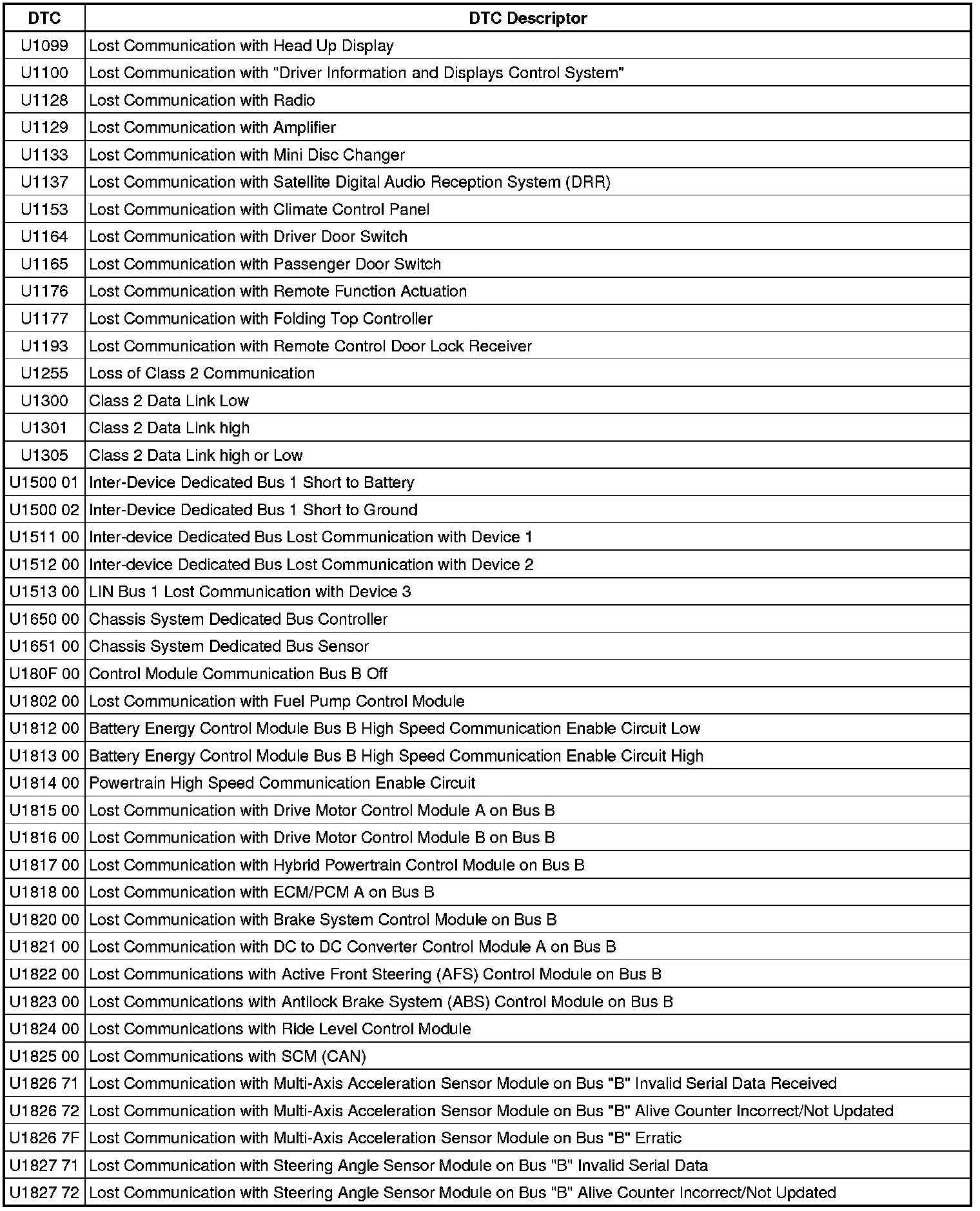 This list includes all Data Communications related U-code DTCs in alphanumeric order with descriptors for all modules. Not all DTCs listed will be applicable to all vehicles.