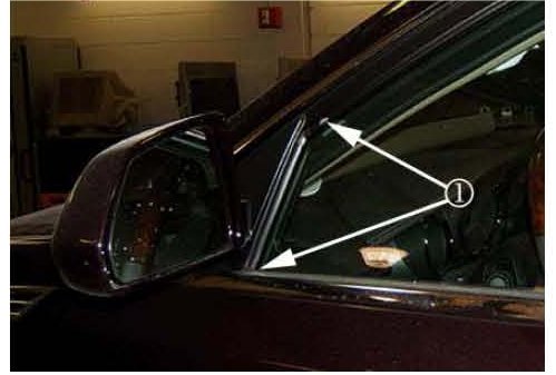 3. Remove the front side door window inner weatherstrip along the vertical section rearward of the outside rear view mirror (1).