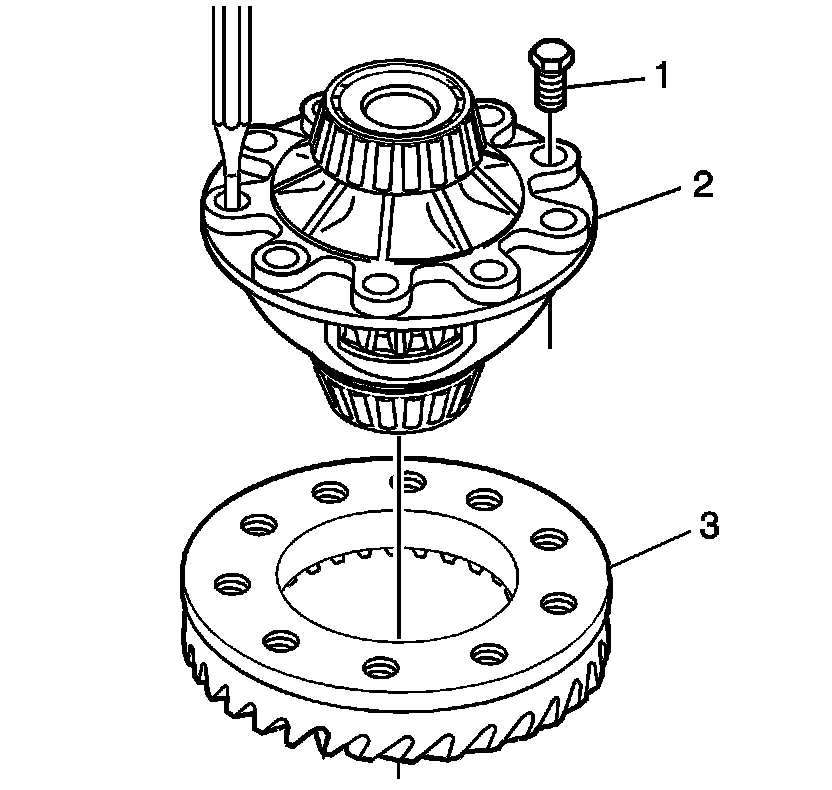 1. Using a punch and a hammer, through a bolt hole, remove the ring gear bolts (1) and the ring gear (3) from the differential carrier (2).