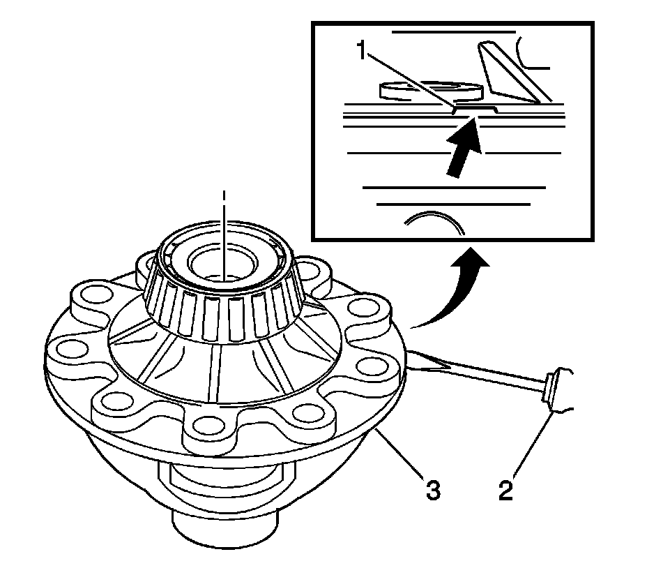 2. Insert a screwdriver (2) in the differential carrier slot (1).