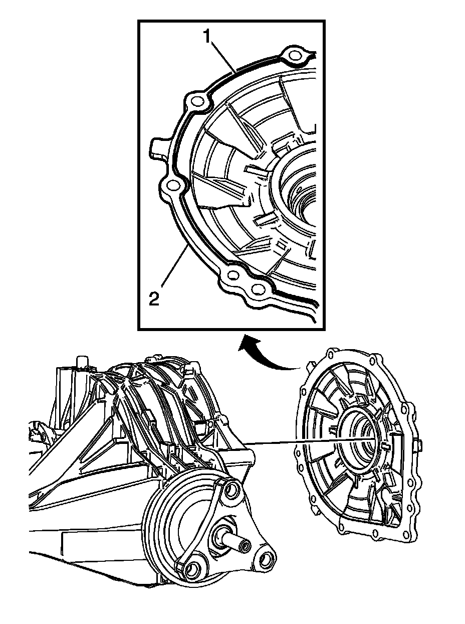 6. Apply a bead of silicone sealant GM P/N 12346286 (Canadian P/N 1095372) (1) 3 - 6 mm (0.118 to 0.236 in) to the side cover (2).