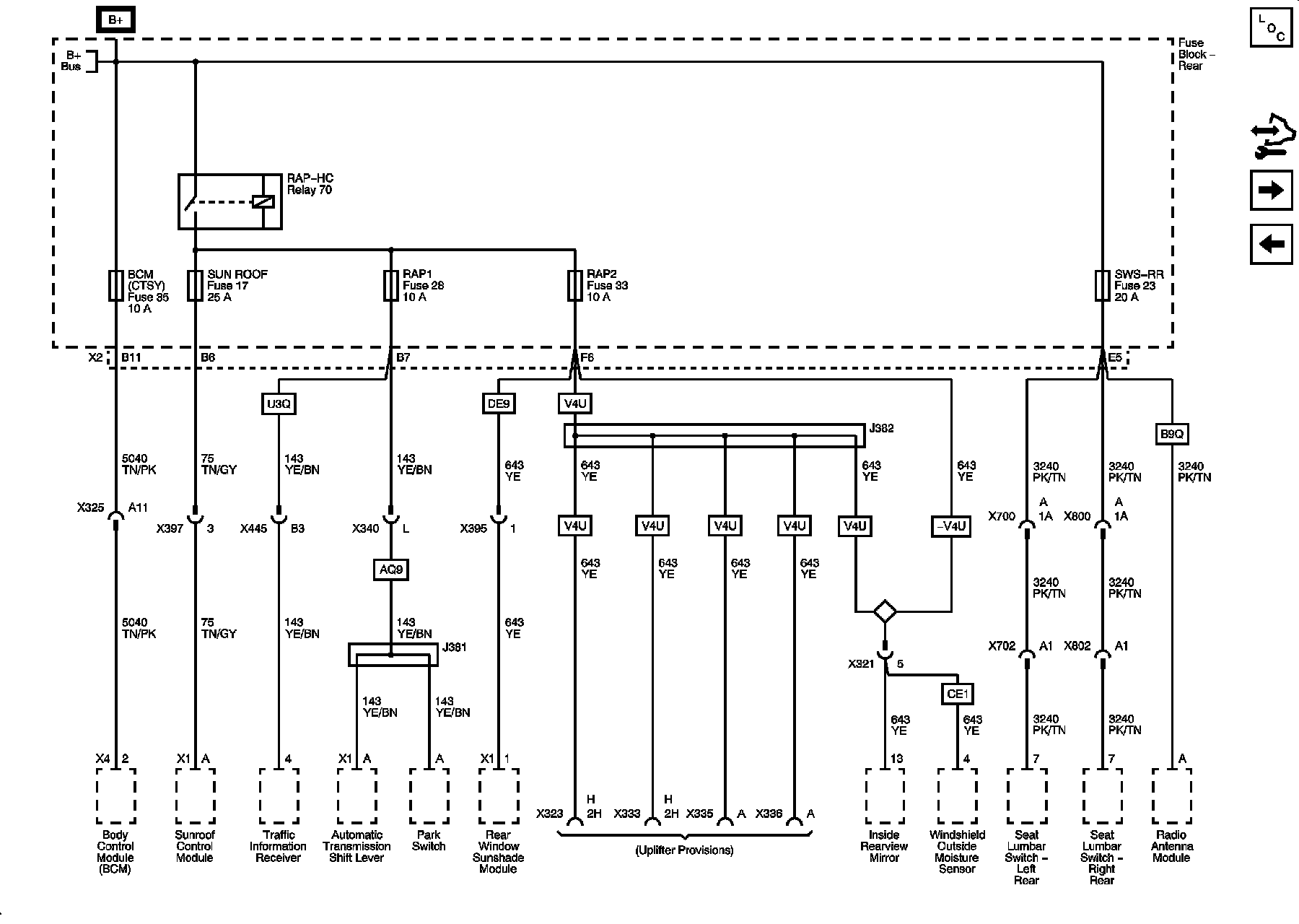Rear Fuse Block - RAP Relay, CTSY/RF TRN, S/ROOF, SHFTR SOL, RAP, REAR SEAT LUM Fuses