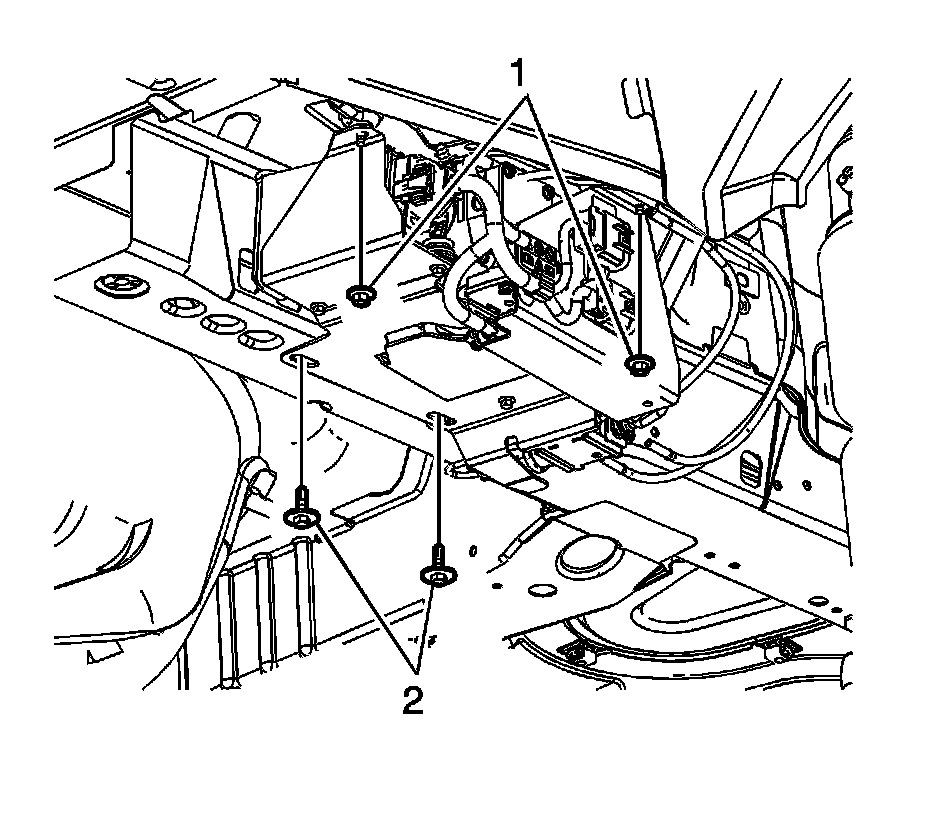 2. Install the air compressor assembly nuts (1) and bolts (2) to the vehicle.