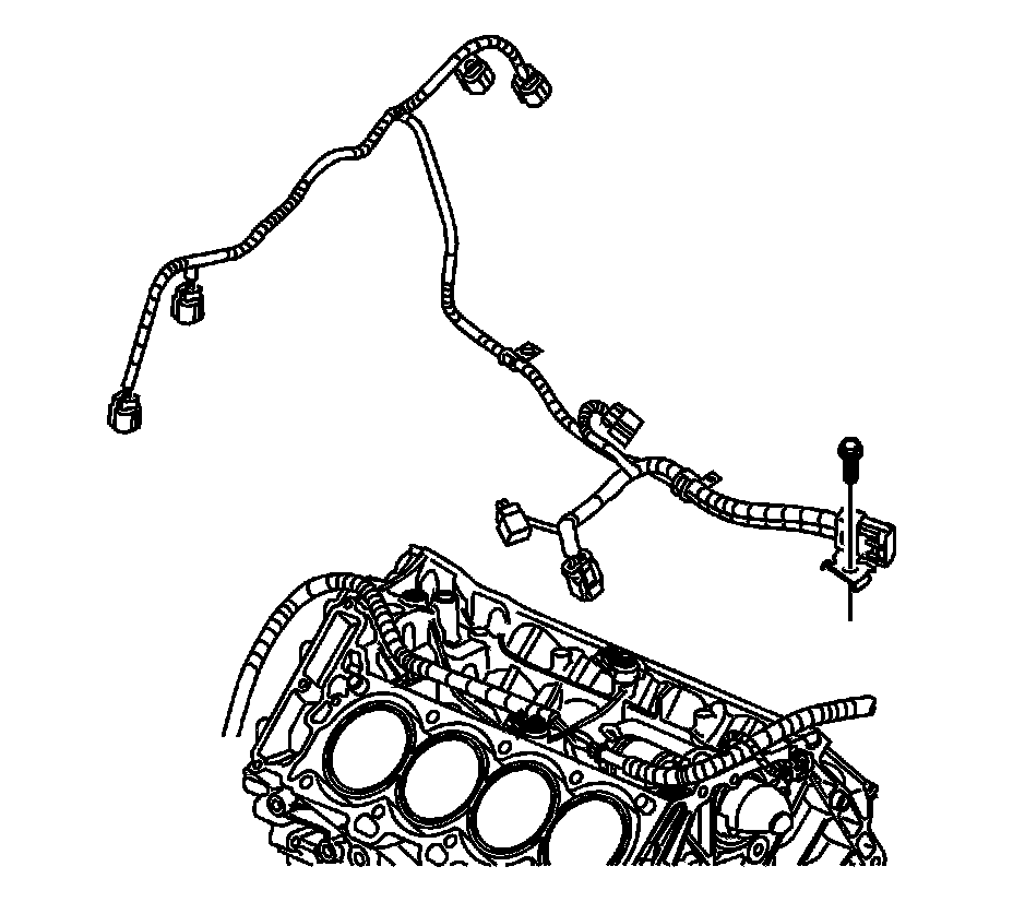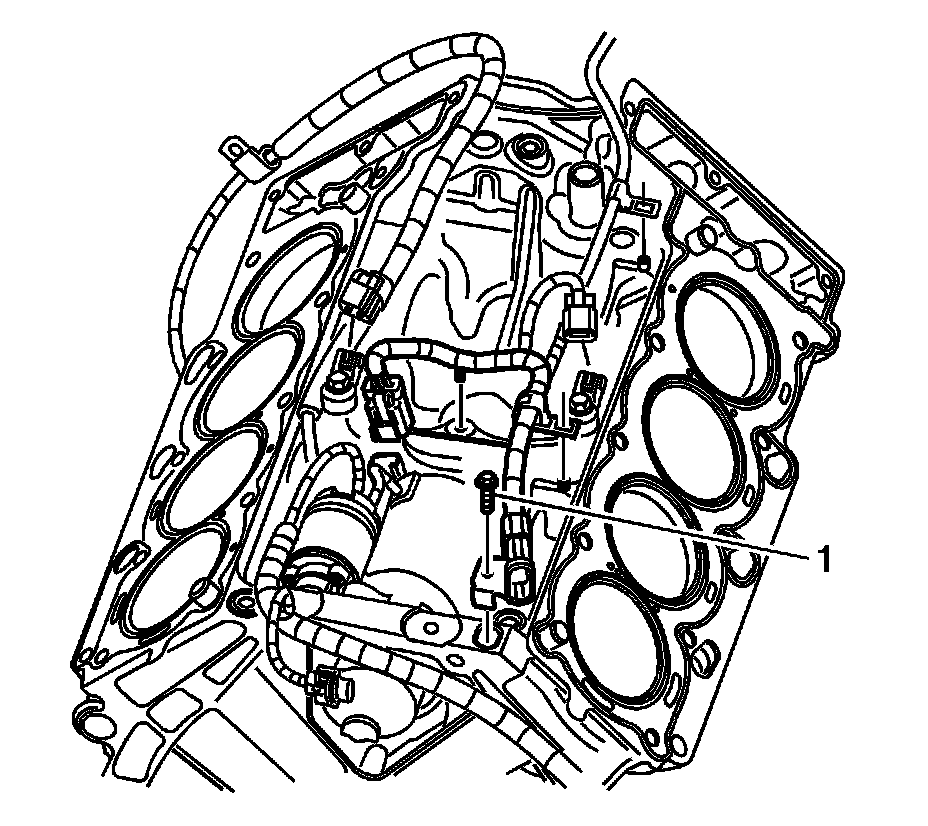 15. Install the knock and crankshaft position sensor wiring harness bolt (1) and tighten to 10 Nm (89 lb in).