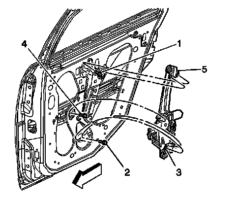 9. Remove the window regulator bolts (1, 2, 3, 4, 5).