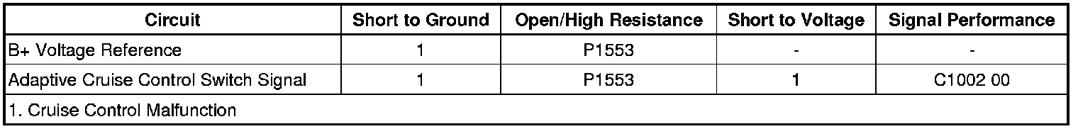 The instrument panel module(IPM) monitors the adaptive cruise control (ACC) gap adjustment switch signal circuit to determine the driver selected headway. The gap switch is a momentary contact switch that connects a series of resistors. Each switch state, inactive, up and down, corresponds to a specific resistance value. The IPM determines the switch selection by the voltage drop across the resistor. The IPM sets DTC P1553 when it detects a stuck gap up/down switch.