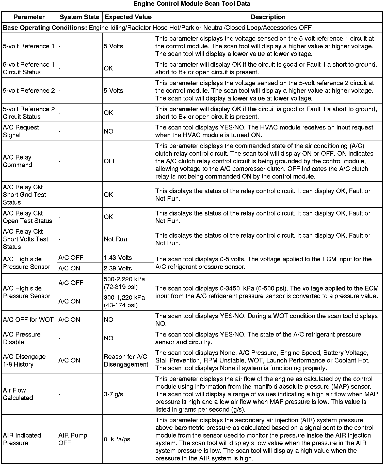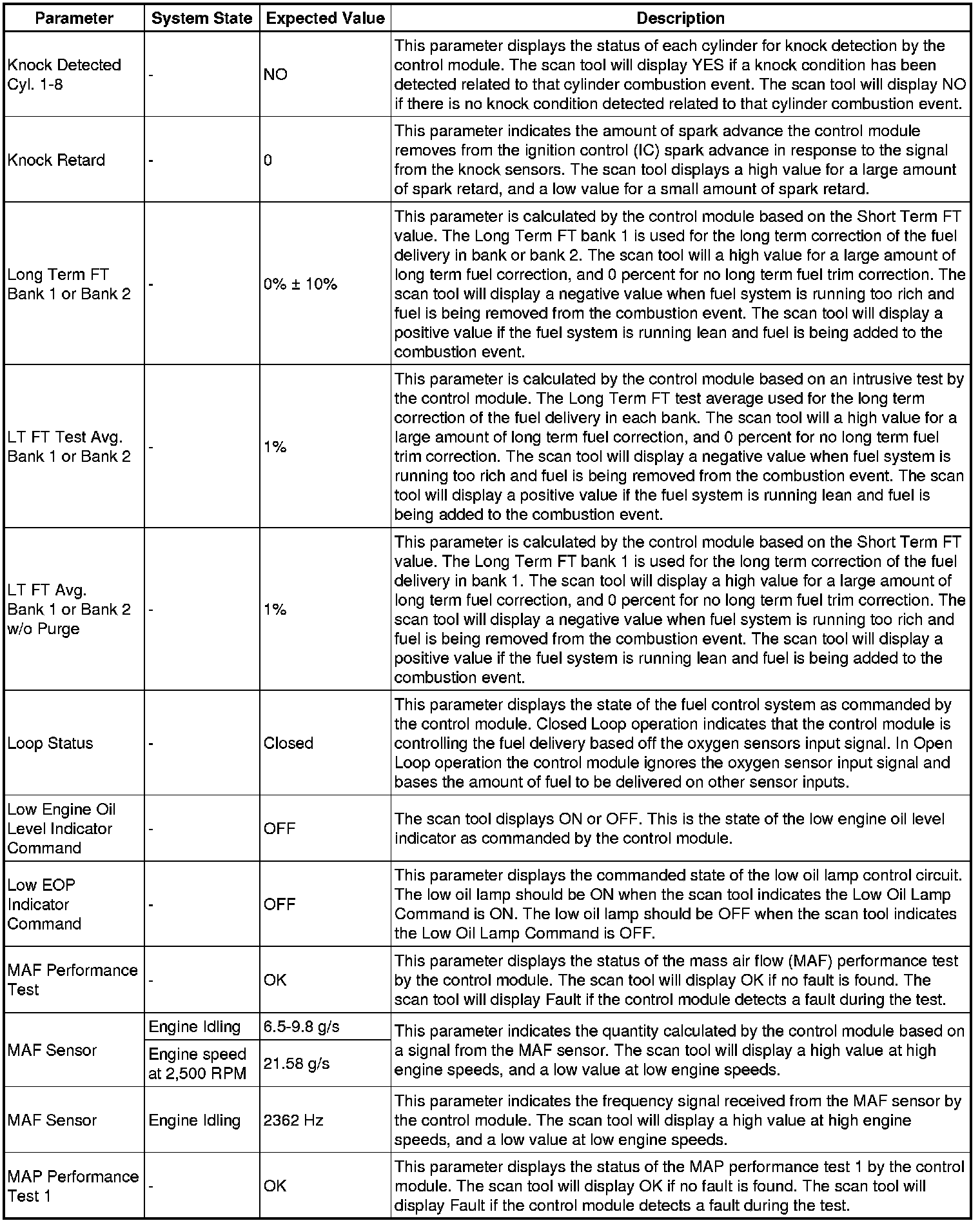 The scan tool values from a properly running engine may be used for comparison with the engine you are diagnosing. The engine scan tool data list represents values that would be seen on a normally running engine.