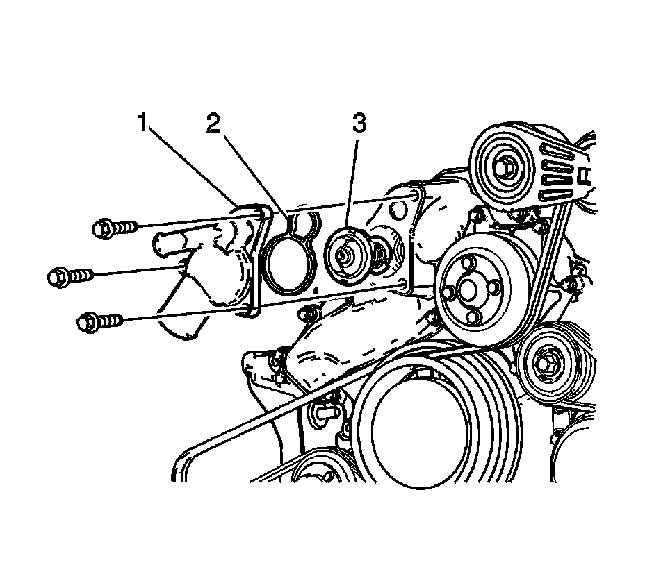 6. Remove the thermostat housing (1) with thermostat (3), from the water housing.