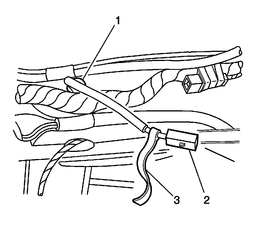 6. On the right side only, attach a piece of string (3) to the electrical connector (2) to aid in routing the wire through the windshield header.
