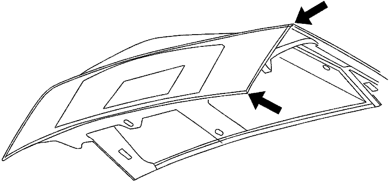 Seal the area of the rear compartment lid inner and outer panels at the outer most vertical seam (between arrows either side). The seam is on the inside of the rear compartment lid. Refer to the illustration above. Use Kent Seam Sealer, P/N P10200, to seal the seam for best appearance.