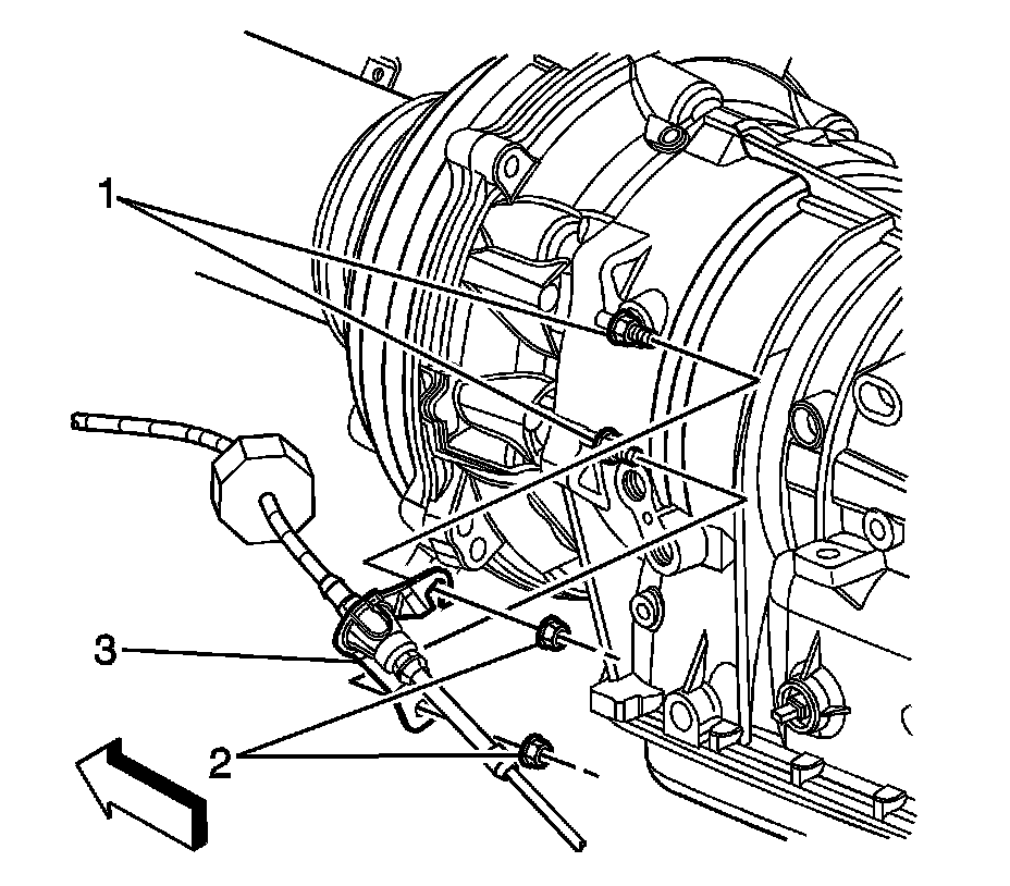 6. Install the nuts (2) retaining the transmission shift cable bracket (3) to the transmission and tighten to 20 Nm (15 lb ft).