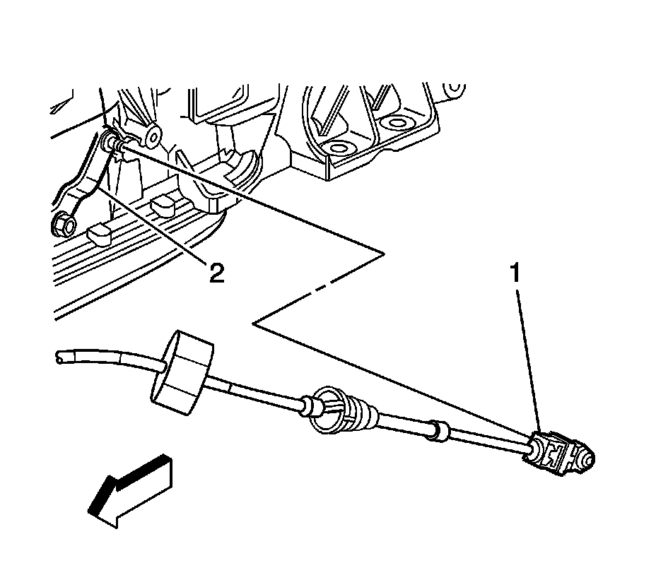 59. Disconnect the transmission shift control cable (1) from the transmission shift lever (2). Unsnap to release the cable.