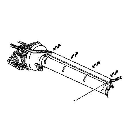 62. Release the retainer (1) securing and positioning the wiring harness to the L-shaped brackets along the driveline support assembly, then slide the harness up and out of the brackets and position out of the way.